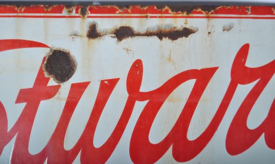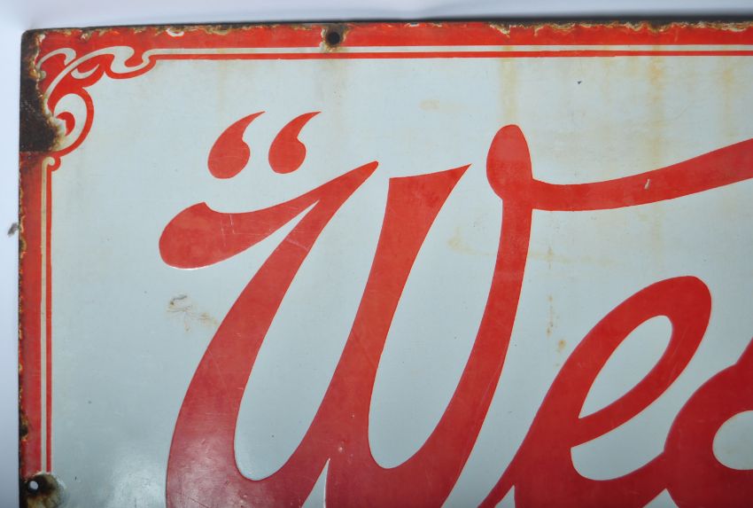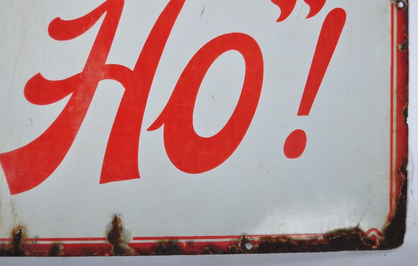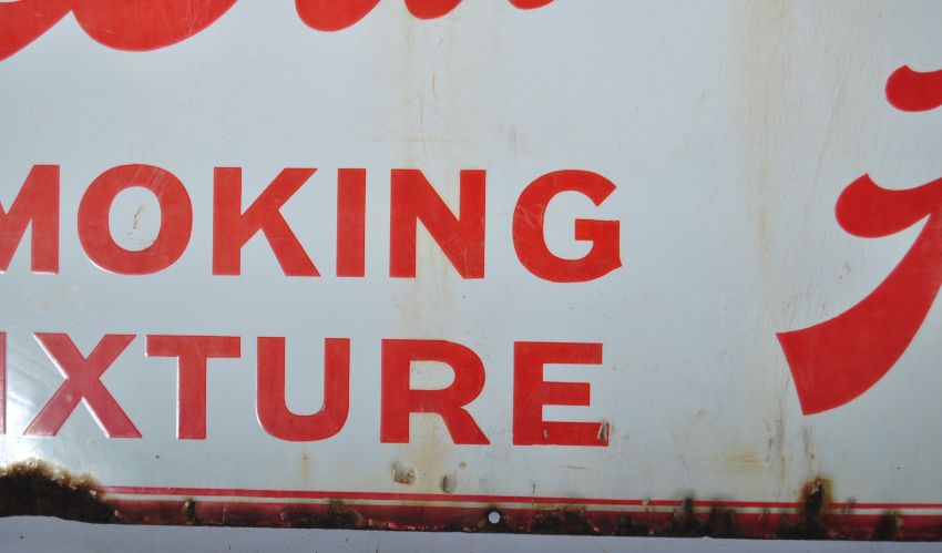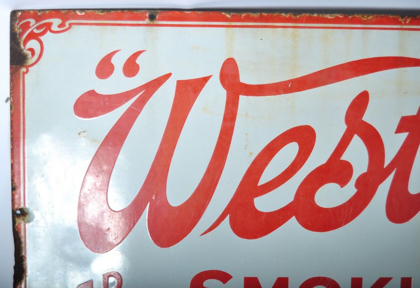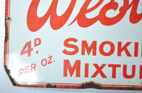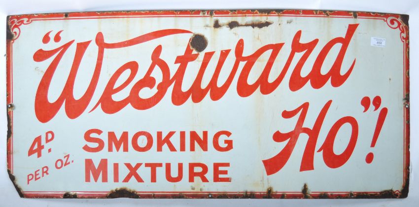 Westward Ho! - A good 20th Century retro vintage enamel point of sale enamel worked porcelain shop advertising sign of rectangular form. The sign having white ground with red borders and lettering reading "Westward Ho"! 4D Per Oz Smoking Mixture. Measures 46cm x 102cm.