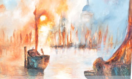 David Chambers (1946-present) - English Artist - An oil on board painting entitled 'St Pauls In The Sunset' depicting multiple boats. Signed to lower left corner. Framed and glazed. Overall size 104cm x 132cm.