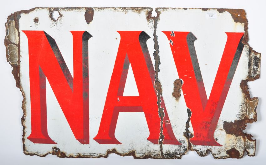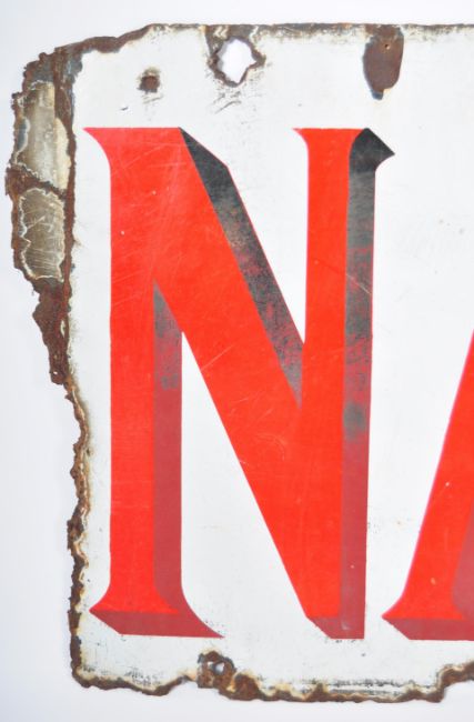 Player's Navy Cut - A 20th Century vintage part enamel point of sale enamel worked porcelain shop advertising sign for Player's Navy Cut. The sign having white ground with red lettering. 'NAV' the visbal part of the sign. Measure 55cm x 89cm.