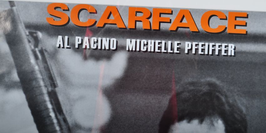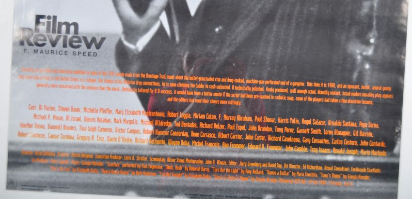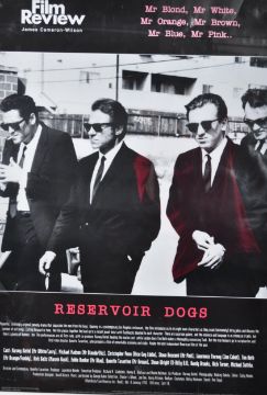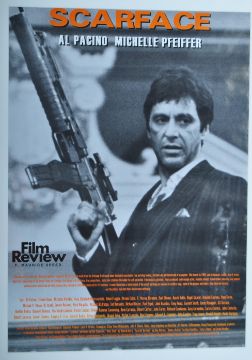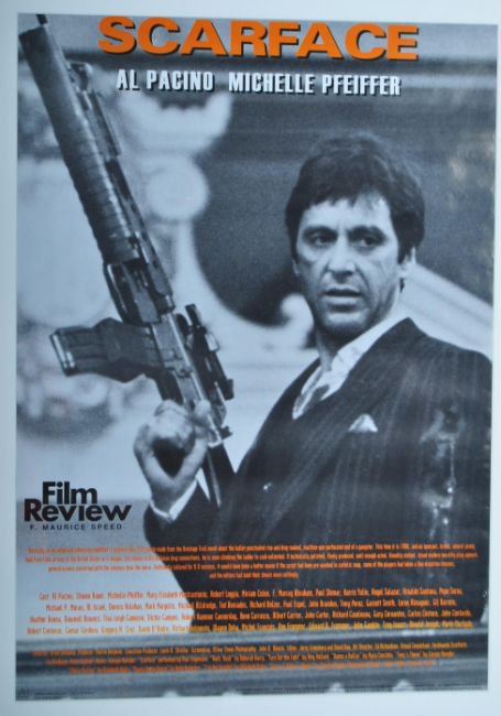 A pair of Film Review ' Classic Movie ' retro advertising posters - Reservoir Dogs and Scarface. Both black and white with some orange text. Each depicting a version of the relevant movie's film poster, with black and white imagery of the stars. Framed. Total size approx; 106cm x 83cm.