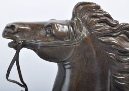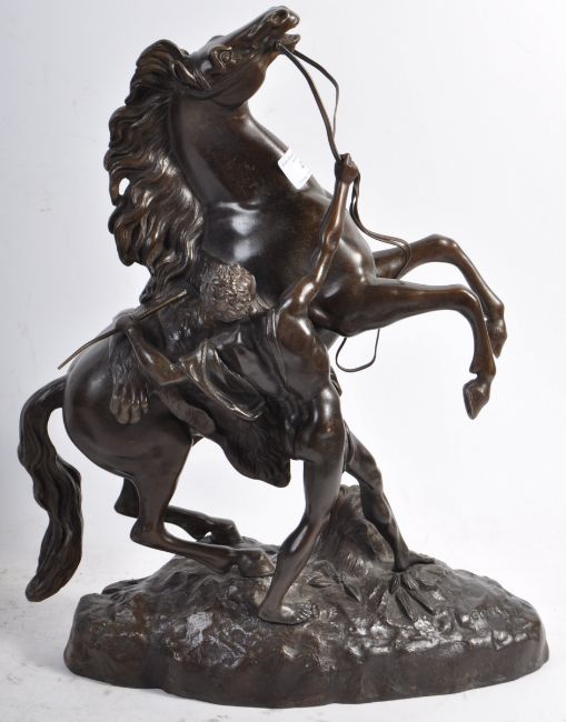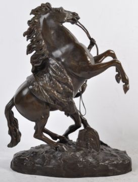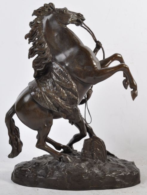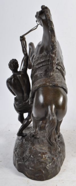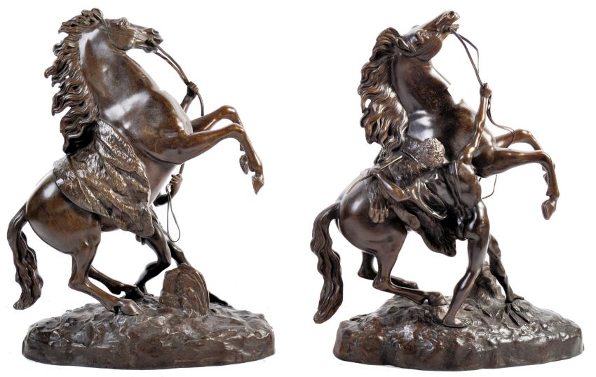After Guillaume Coustou The Elder (1677-1746) - Horse Tamer from Marly-le-Roi - A French antique large pair of bronze statues figurines in the form of the iconic Marley Horses. Each bronze statue depicting a wild horse being tamed raised on naturalistic bases. Signed Coustou to bases. Fantastic display pieces. Measures: 41cm tall.
