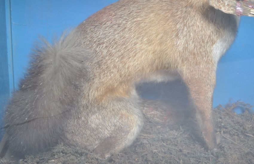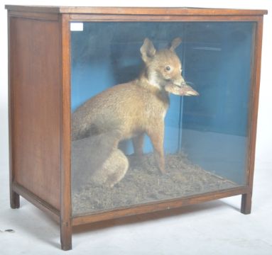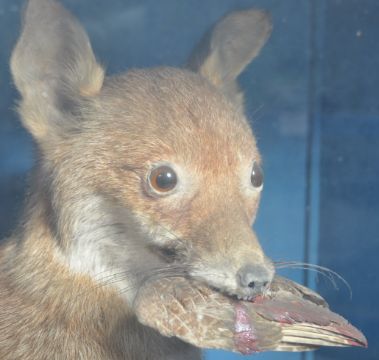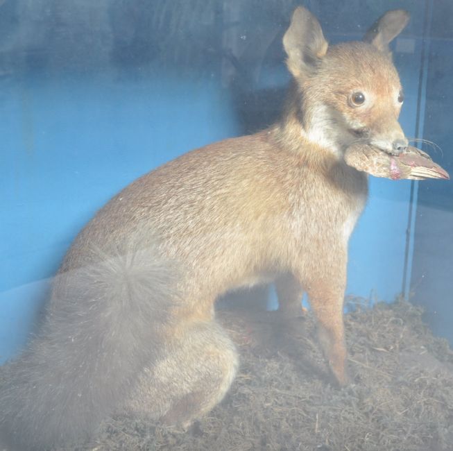 Taxidermy and Natural History Interest - English fox - A late 19th Century Victorian antique oak cases taxidermy example of a fox in seated position having a ducks wing in his mouth. Blue painted background with naturalistic floor and a single glazed panel front.