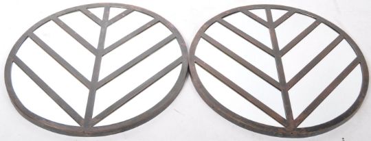 An impressive pair of original antique early 20th century Art Deco 1920's stylised bronze window frame mirrors. The once-window frames being circular, with a central lined motif running through the centre. Later repurposed into mirrors, as per their current form. An impressive pair of industrial mirrors. Each measures approx; 76cm diameter.