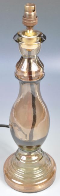 A 20th Century retro vintage style smokey amber glass table lamp light of shapley form having a waisted neck with bulbous body raised on a circular base. Measures 35cm x 10cm.