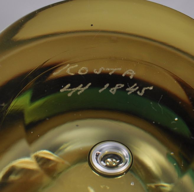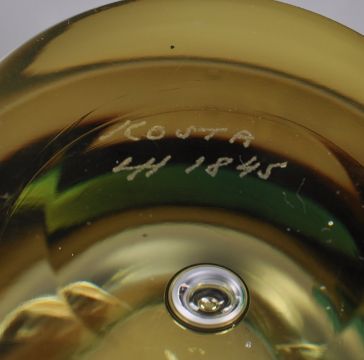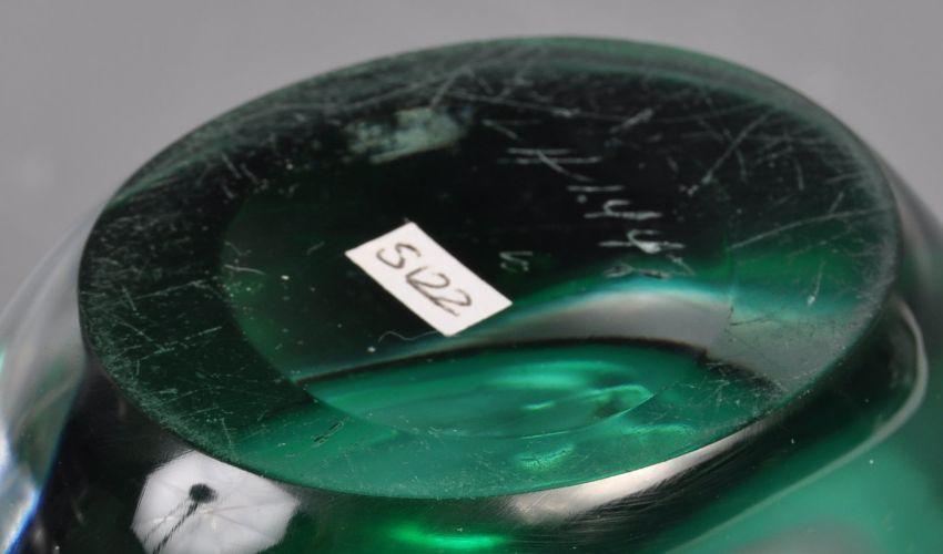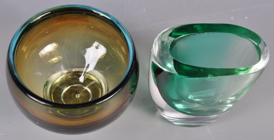 Vicke Lindstrand - Kosta Boda - two mid-century 1960's Swedish studio art glass pieces. The first being a smoked brown with green hues asymmetric bowl, and the other an asymmetric vase in green. Both signed to base. Tallest approx; 12cm tall.