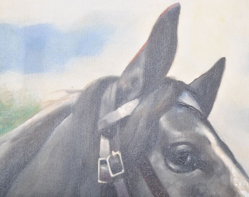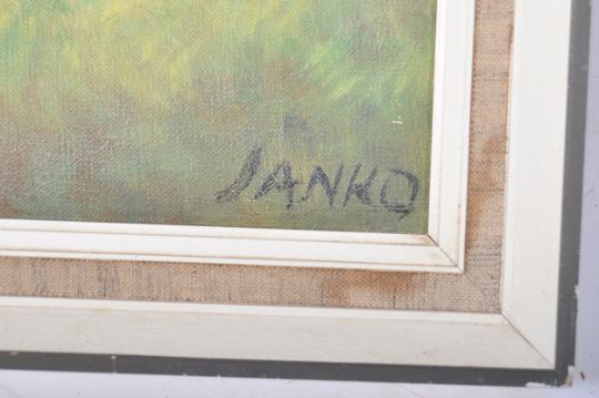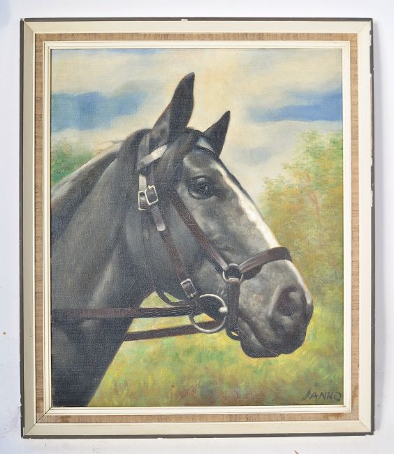 Janko - A mid Century retro vintage oil on canvas equestrian study painting of a horse signed to the lower right Janko. The grey finished horse depicted wearing a harness and reins with a cloudy blue sky and grassland backdrop. Set within a white frame. Measures 58cm x 48cm.