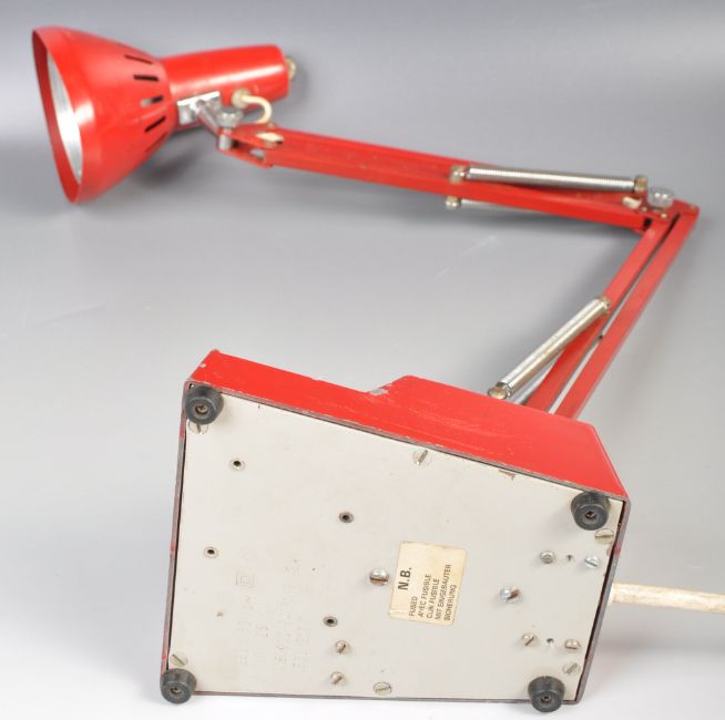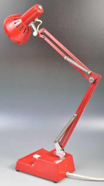 Ledu Norwalk, Connecticut - Mini-Ledu - A good 20th Century Swedish retro vintage articulated anglepoise desk / table drafting lamp light by Ledu in the Mini Ledu range. The lamp having having a conical shade with cooling holes raised on a weighted stepped base having a plastic button. All finished in a red colourway. Measures 48cm.