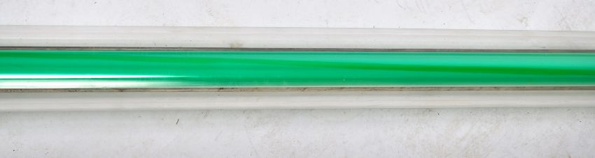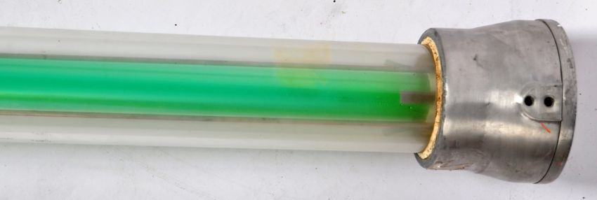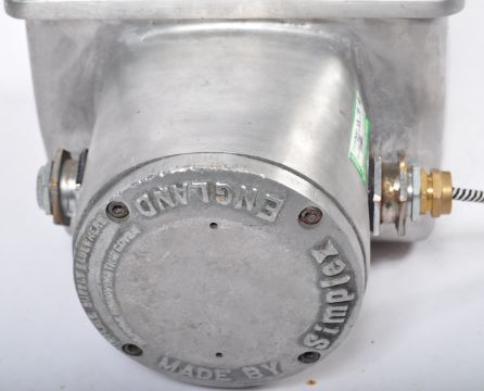 A large 20th Century retro vintage Industrial explosion proof floor standing - wall fit tube strip light by Simplex dating to the 1950's. The large glass cylinder shade housing a green gel tube light having a stunning large polished aluminium box mounted base. Originally from the British cellophane factory being rewired. Measures 189cm.