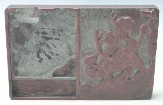 An antique early 20th Century Chinese ink block of rectangular form having avian and floral decoration in relief.