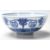 An early 20th Century Chinese blue and white bowl being hand painted in blue and white with cranes in flight between roundall marks having a patterned decoration beneath, the interior of the bowl having a five toed Imperial dragon. Raised on a footed base with Qianlong character marks to the base.