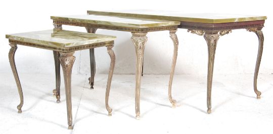 A mid-century retro marble and gilt metal nest of tables in the rococo manner. Raised on gilt metal rococo frames with detailed frieze having green marble / alabaster veined tops. Measures 50 x 100 x 50cm.