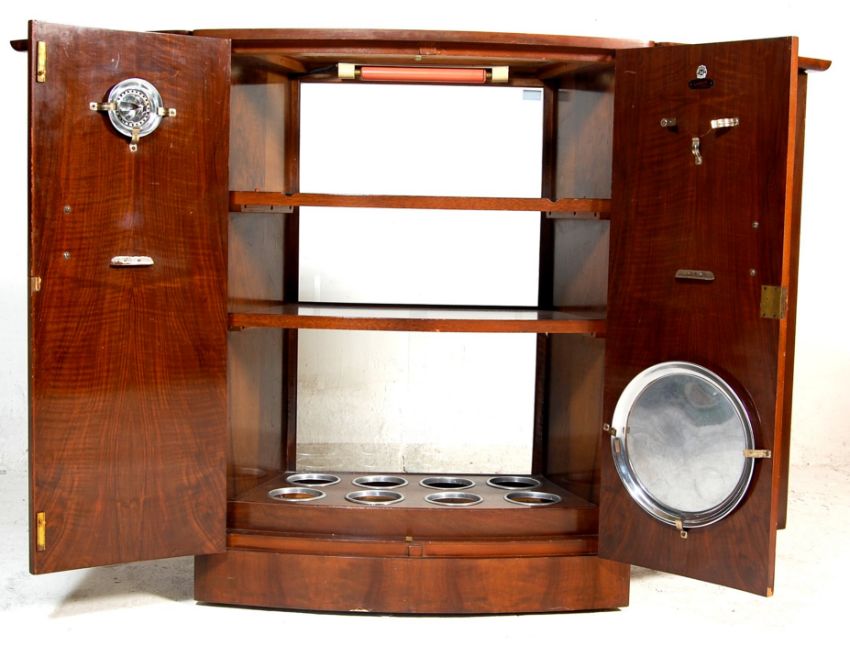 A mid century retro teak wood cocktail drinks bar by Turnidge having an ebonised plinth base with double doors opening to reveal a sectional interior within. Fold over bar top above. Measures 104 x 160 x 43cm.