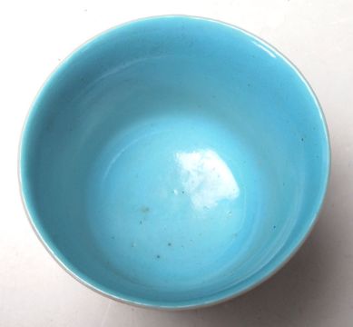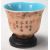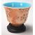 A Chinese 20th Century small cup / bowl of waited form having a blue interior with having painted smoke design to the sides and character marks. The base stamped with a red mark to the base. Raised on a carved wooden base.