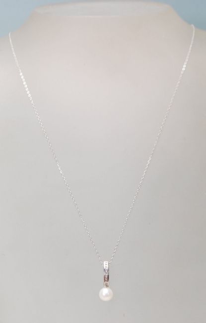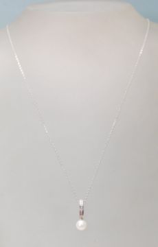 A stamped 9ct white gold necklace having a drop of a pearl and ten diamonds set in a marquise shaped pendant held on a tracer chain. Stamped to the pendant and chain. Weighs 2.1g, chain measures 17 inches.