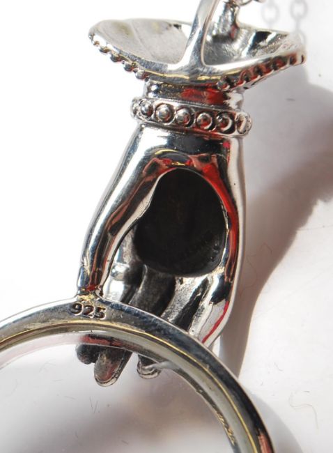 A stamped 925 silver pendant necklace having a magnifying glass pendant with a round glass and hand handle set with red stones, on a fine link necklace chain. Chain and pendant marked 925. Weight 21.2g. Chain measures 17 inches.