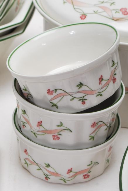 A large Johnson Bros Eternal Beau dining service / tea service comprising of six bowls, six cups and saucers, six tea plates, milk jugs, sugar bowl, lidded tureen, oval meat platers, etc.