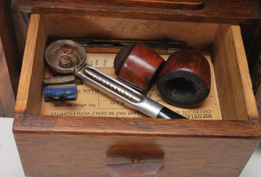 A 1930's Art Deco oak smokers cabinet. Of angular form with glazed door housing a central tobacco jar with pipe rack. Complete with associated pipes and leather tobacco wallet.