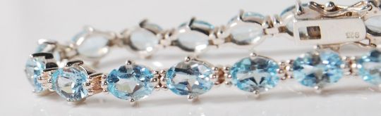 A stamped 925 silver ladies line bracelet set with oval cut blue stone with a box clasp. Clasp marked 925. Weight 12.8g. Measures 7 inches.