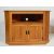 A pair of contemporary oak corner units / entertainment units / corner cupboards having flared tops with recess beneath and twin cupboard doors with ebonised pull handles.