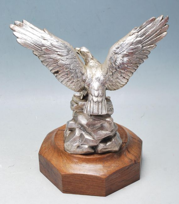 A vintage 20th century large white metal American eagle raised on a naturalistic base.
