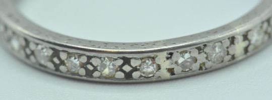 A vintage 18ct white gold and diamond eternity ring set with round cut diamonds throughout. Assay marked London. Weight 2.9g. Size S.5.