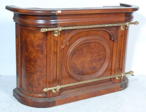 A Victorian style mahogany and burr walnut bar of demi-lune form with two brass cylindrical rails and cupboards to the rear. Raised on a plinth base. Measures  110 H x 168 W x 52 D