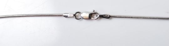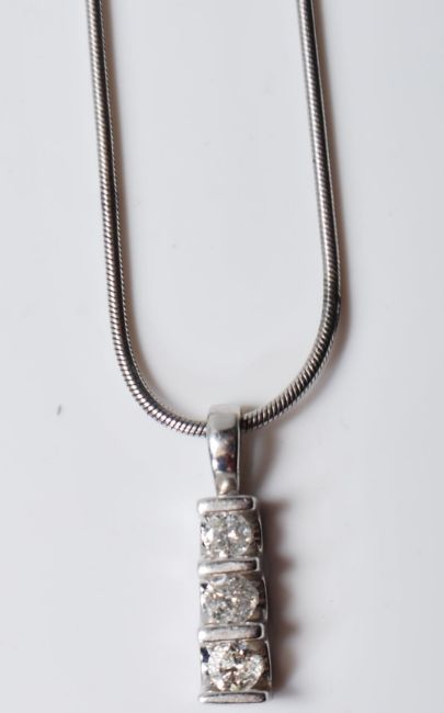 A 9ct white gold diamond pendant necklace having a snake chain with a lobster clasp and a pendant set with three brilliant cut diamonds. Clasp marked 375, pendant marked 375. Weight 8.8g. Chain measures 61cm. Diamonds estimated approx 0.4 ct's.