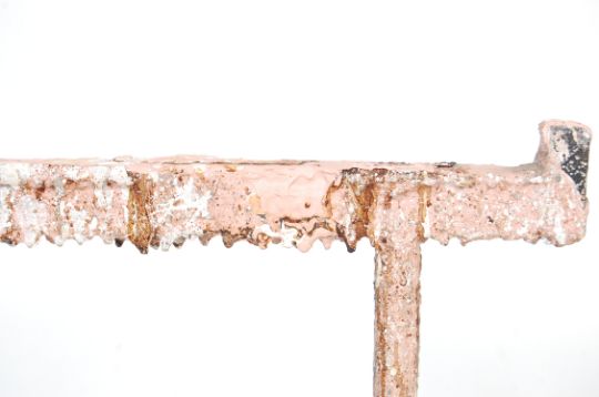 A pair of vintage 20th century metal trestle legs / stand of a typical form raised on shaped supports. Measures, 74 cm H x 78 cm W x 39 cm D