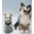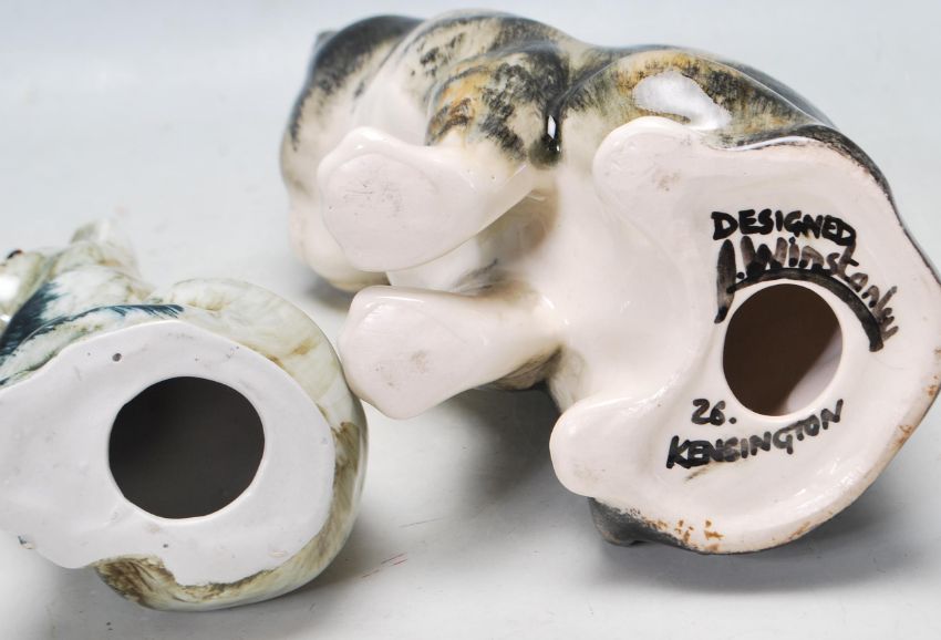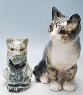 A contemporary ceramic tabby cat by A Winstanley having cathedral glass eyes together with another tabby cat. Signed A Winstanley 26 Kensington to the base. Measures, 22 cm tall