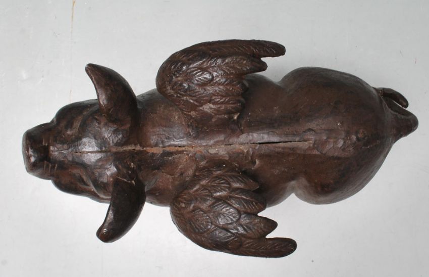 A late 20th century vintage bronze figurine in the manner of flying pig. The pig has two angel wings and a typical corkscrew tail.  Measures 18cm high x 28cm long.