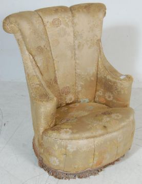 A late 19th century Victorian bedroom chair / easy chair, having fun shaped backrest, scrolled arms with yellow upholstery raised on casters. Measures 82 H x 54 W x 65 D