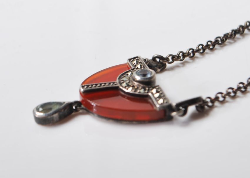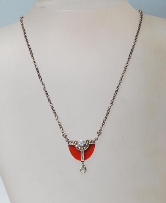 A vintage 20th century silver and marcasites Art Deco style necklace having a Demi lune shape pendant. Marked 925 Sheffield. Total gross weight: 11.3g