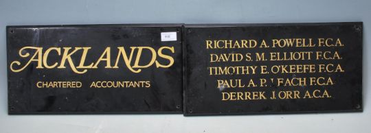 A pair of wooden mid century retro hand painted office - shop signs. Each wooden panel being ebonised with gilt notation for Acklands Chartered Accountants with names on 2nd plaqueMeasures, 46 cm x 23 cm