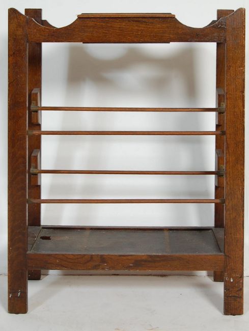 A mid century 1940s mirror backed oak coat rack together with an oak hall / stick stand of rectangular form with a central lidded cupboard set over a shoe rack set on straight supports. Measures 92 H x 71 W x 28 D