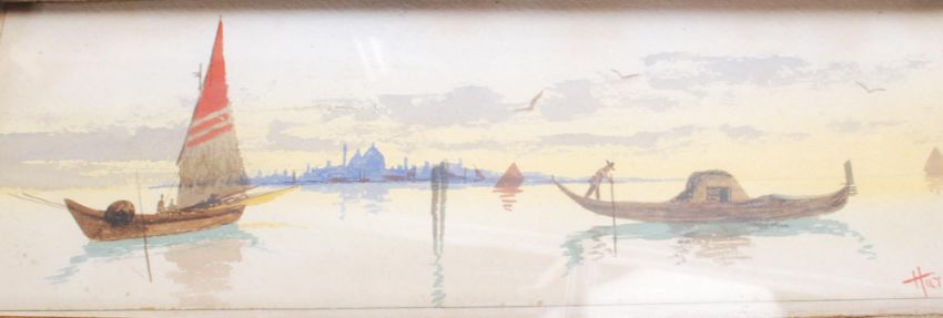 L Hudson - A collection of antique late 19th / early 20th Century water colour and oil on board paintings, many depicting Venice and Italy together with an unsigned French watercolour. All framed and glazed, on in a gilt Art Nouveau frame. Six in total. Measures  44 H x 27 W