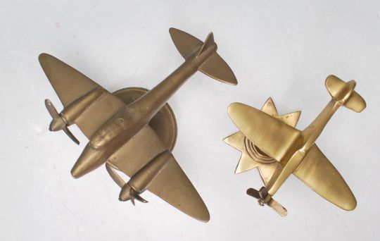 Two vintage 20th century trench art style WWII brass aeroplanes to include a Bristol Beaufighter and a Hurricane. Both raised on a plinth base.Measures, 13 cm Tall