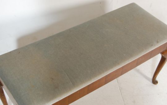 An antique 20th century mahogany duet piano stool having a hinged seat raised on Queen Anne legs.Measures 45 H x 93 W x 35 D