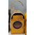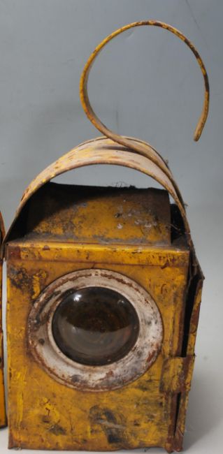A group of three late 20th vintage industrial salvage work lights painted in a yellow colourway having a carry hook to the top and a circular amber glass to each side. Branded Parker, Hardun and Chalfun.Measures, 38 cm Tall