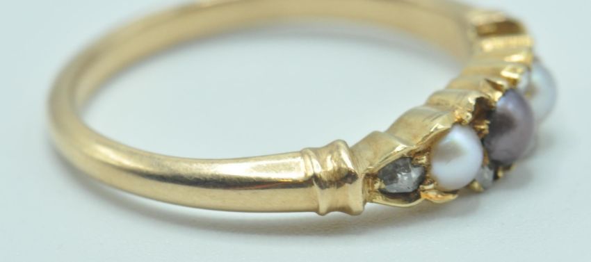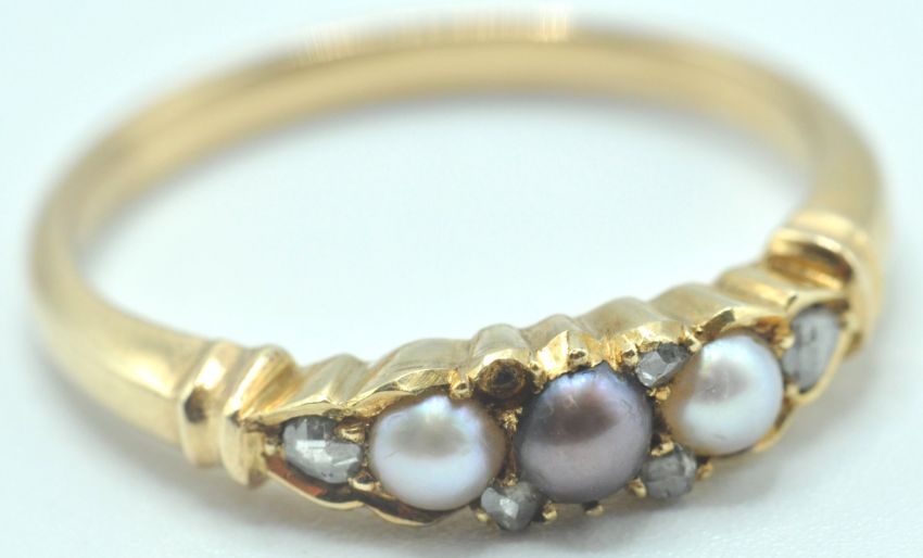 A late 19th / early 20th Century gold and seed pearl ring having a central black pearl planked by two white pearls with old cut diamonds throughout (one stone missing). Unmarked but tests as 15ct gold. Weight 2.8g. Size N.5.