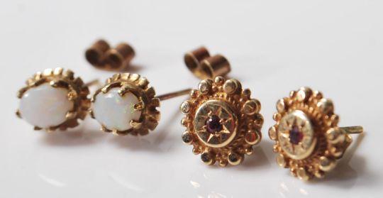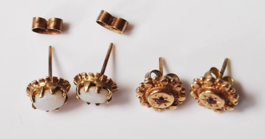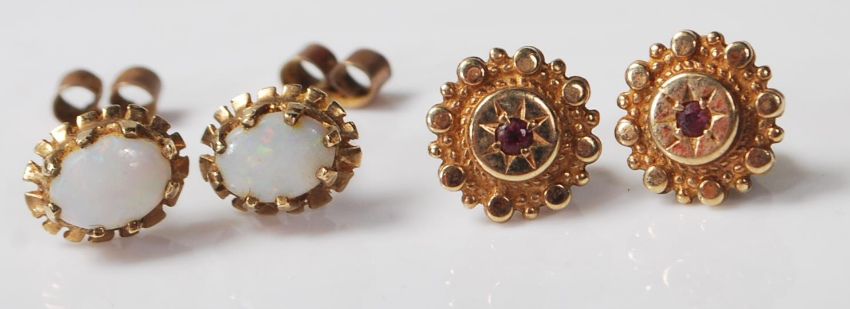 A pair of antique late 19th Century / early 20th Century 9ct gold stud earrings set with round red stones (unmarked but test as 9ct gold) together with a pair of 9ct god earrings set with oval opal panels (replacement backs, posts unmarked but test as 9ct gold). Total weight 3.0g.