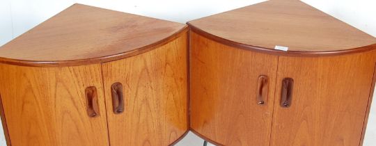Victor B. Wilkins - G-Plan - Fresco - A pair of 1960's retro vintage teak wood bedside cabinet cupboards by G plan. Each having rounded fronts with double doors opening to reveal a hollow interiors. Both raised on hairpin legs.  Measures: 63cm x 64cm x 45cm.
