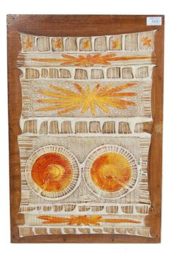 A retro vintage 1970s West German pottery picture painting in relief having sunburst panels decorated in fat lava style colourway. 62cm x 42cm.
