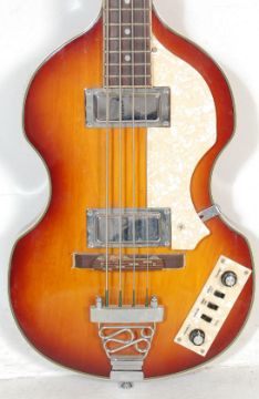 Vintage mid century Tanglewood RVB-2 violin bass guitar having sunburst finish straight neck, mother of pearl effect scratch board.