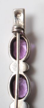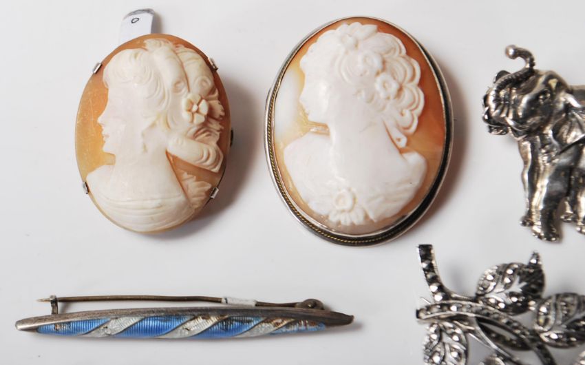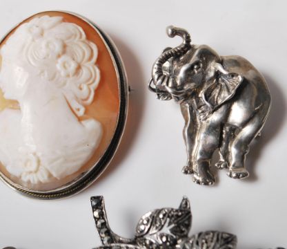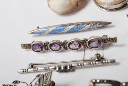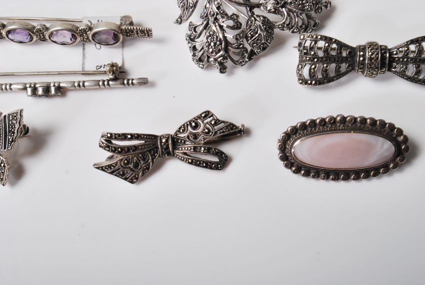 A group of vintage silver brooches to include a floral brooch set with marcasite's, a butterfly brooch set with amethysts and marcasite's, a bar brooch set with four oval cut amethysts, two bow brooches set with marcasite's, an elephant brooch etc Weight 79.3g.