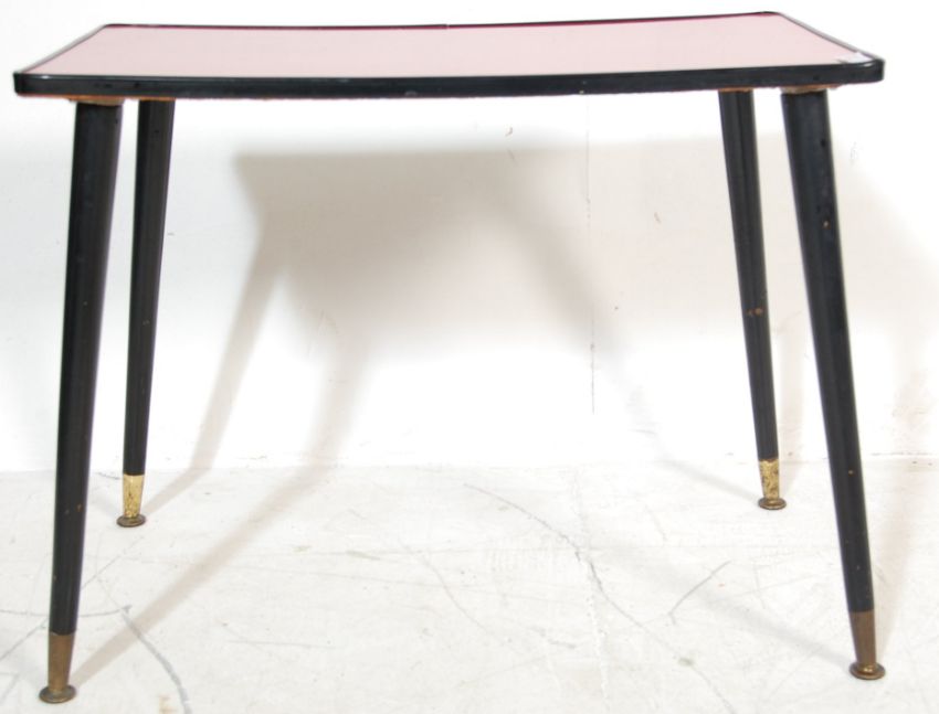 A vintage late 20th century red Formica coffee table of a rectangular form raised on dansette style tapered ebonised supportsMeasures 48 H x 62 W x 38 D