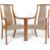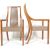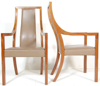 A pair of retro vintage 1980s office / boardroom teak wood chairs. The chairs have an upright back with shaped elbow rests having a leather seat in a beige colourway set on square legs The chairs are stamped property of Citibank to the base.Measures  106 H x 57 W x 43 D