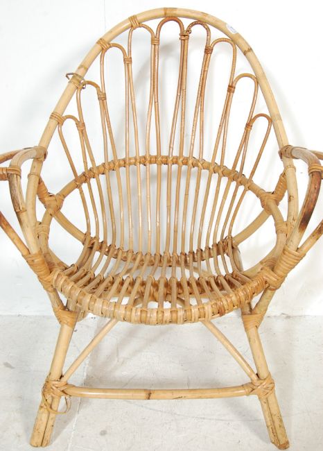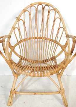 A mid century bamboo ' safari ' type armchair in the manner of Franco Albini together with a 1960's footstool ottoman of mushroom form also in the manner of Franco Albini.