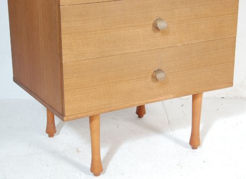 A retro vintage mid century teak wood chest of drawers by Avalon. The chest is of upright form and has a bank of five drawers with wooden shaped pulls raised on circular legs. Makers stamp to the inside.Measures 112 H x 62 W x 44 D