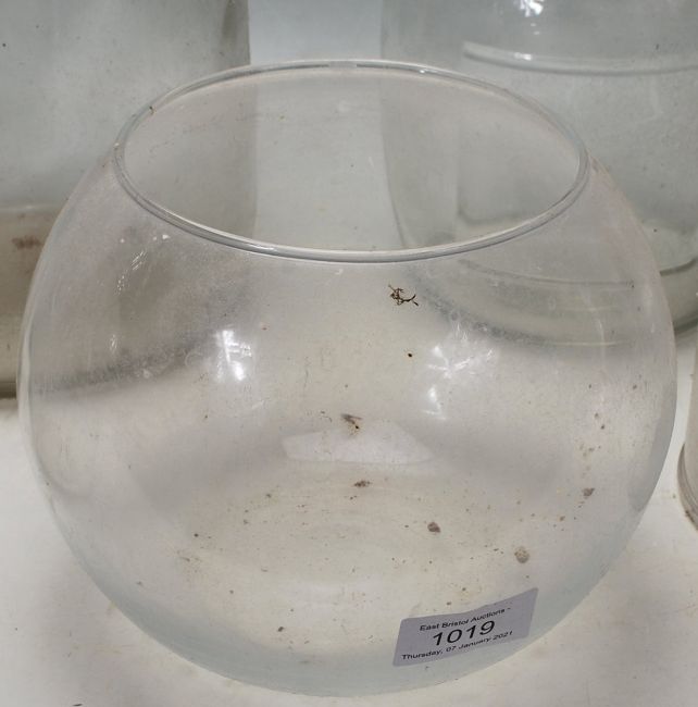 2 vintage glass 20th century goldfish bowls together with a collection of full and half sized demi johns and an unusual scientific glass funnel