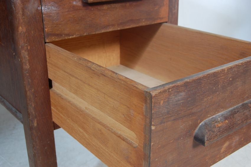 A mid century Air Ministry style oak twin pedestal desk. Raised on squared legs with a pedestal of drawers to each side with chamfered edge desk top above and over kneehole recess.